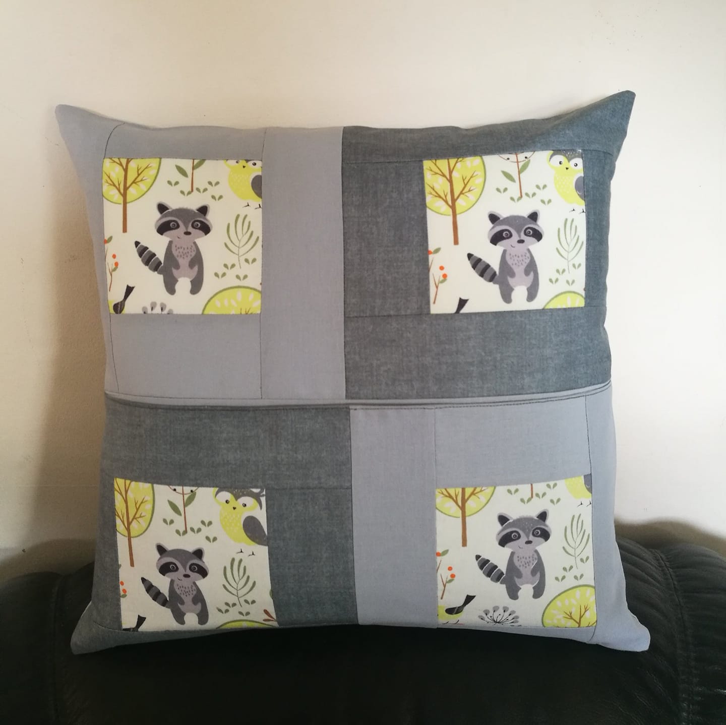 Grey raccoon reading cushion